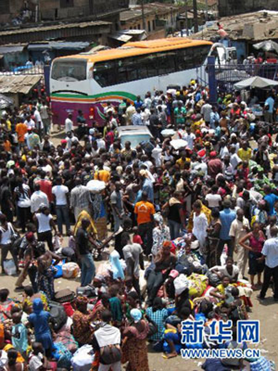 The following picture shows the Ivorian people wanted to leave for other countries were waiting for buses at the bus station in Abidjan, economic capital of Côte d'Ivoire, on March 23, 2011. Among the fleeing Ivorian people, Yutong buses were spotted and helped to transport the Ivorians to safety areas.