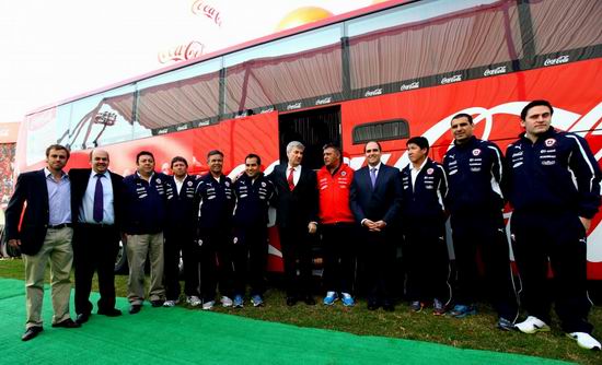 Together with Chilean Football Association, Coca-Cola company held a launch ceremony of the national football team specific bus on May 3, 2012. Mr. Gonzalo, president of Coca-Cola Chile, Mr. Sergio, chairman of Chilean Football Association, and Mr. Claudio, coach of Chilean national football team were present at the ceremony and delivered speeches.